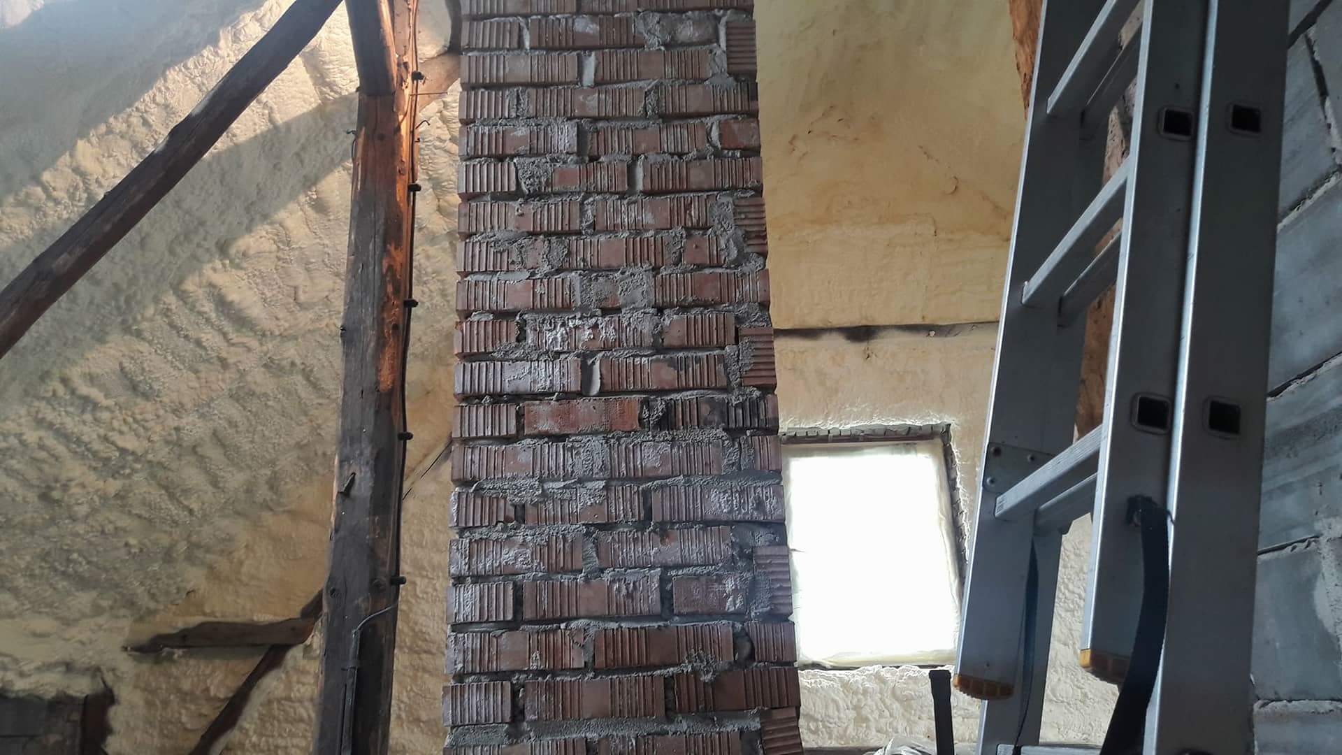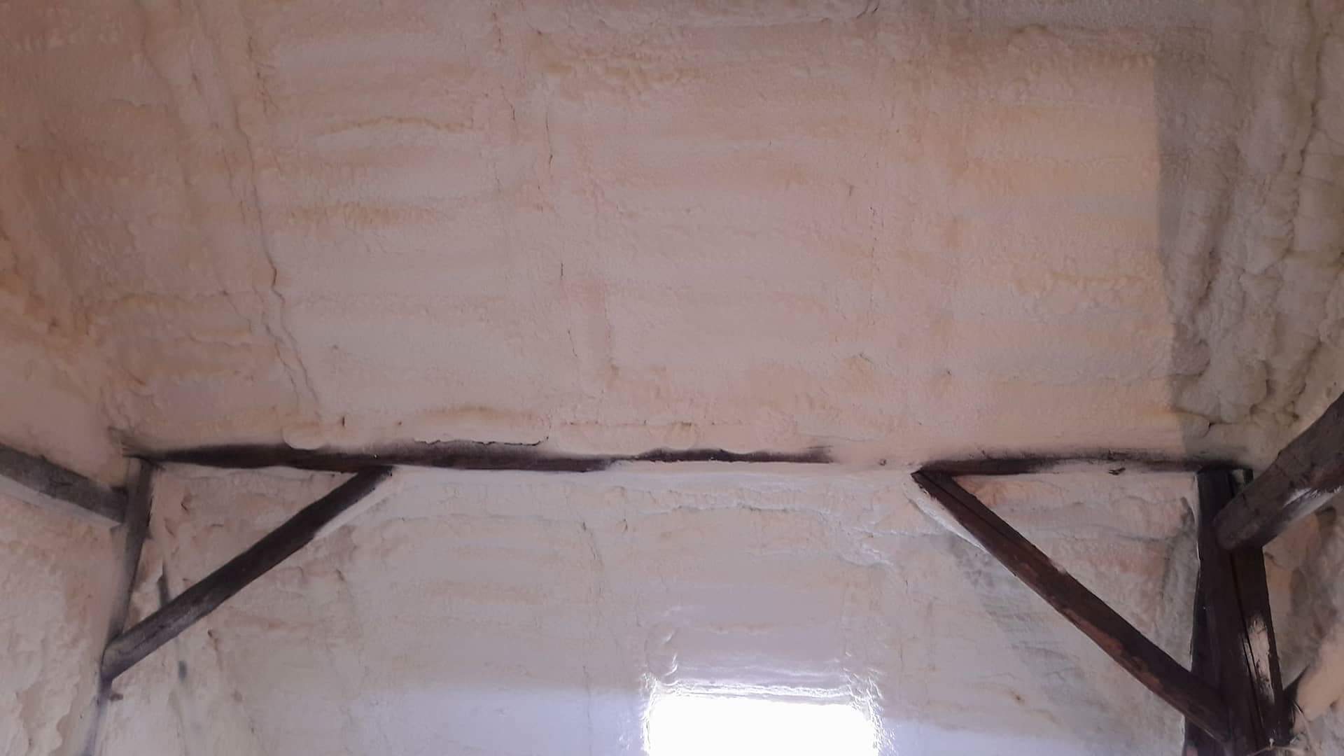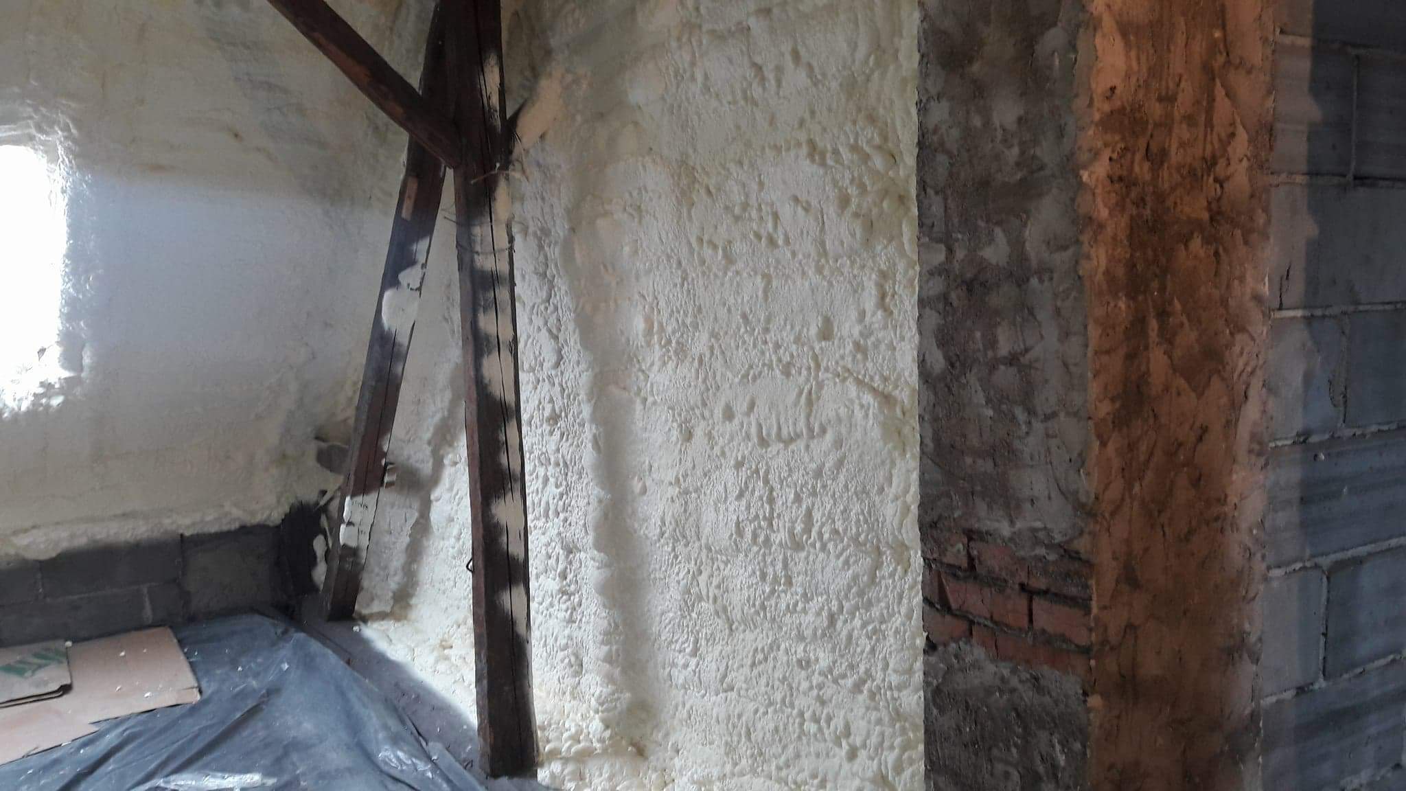 Docieplenie dachu oraz ścian szczytowych pianą PUR. Do ocieplenia wybrano pianę niepalną, samogasnącą. Grubość 20 cm.