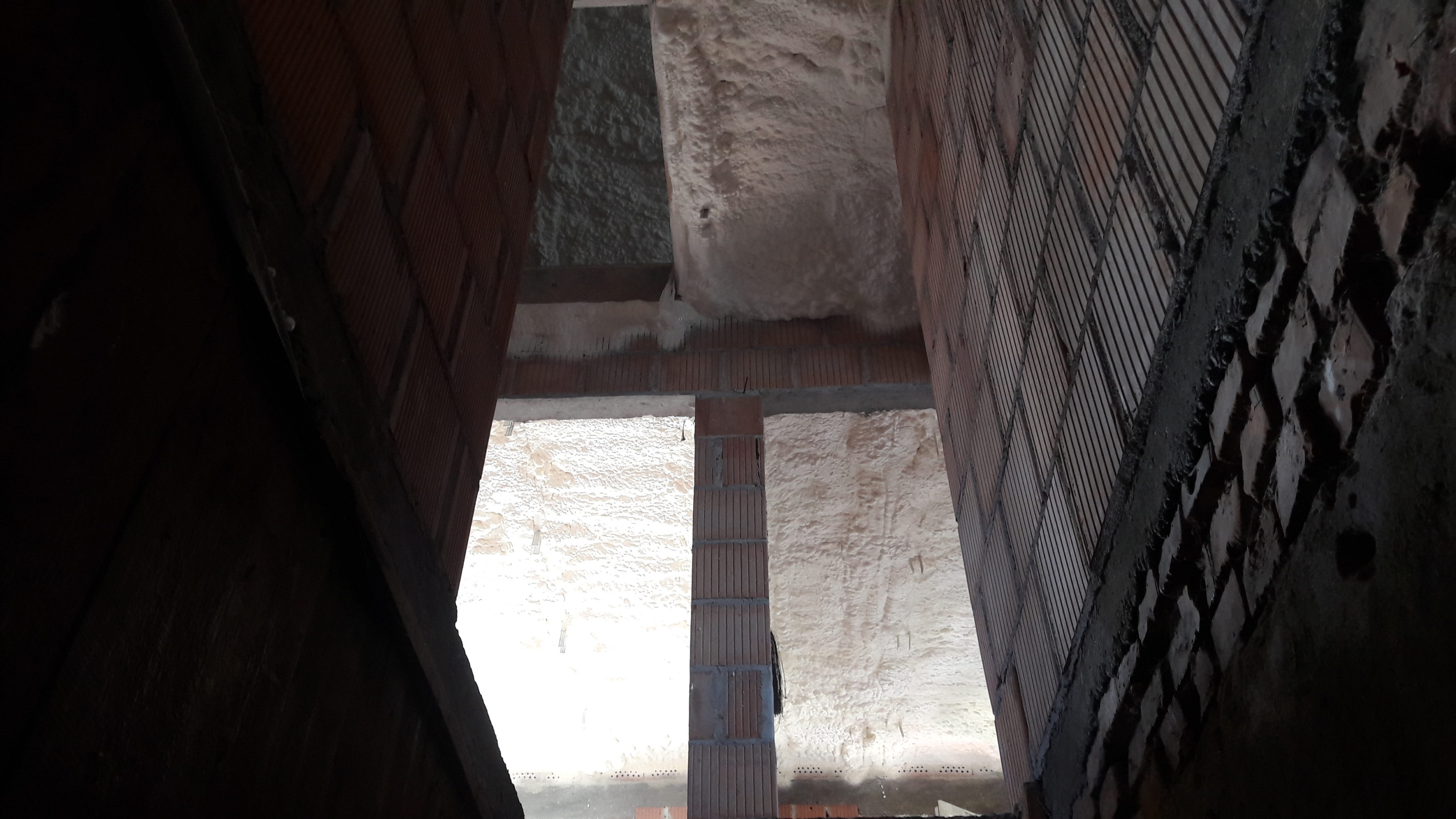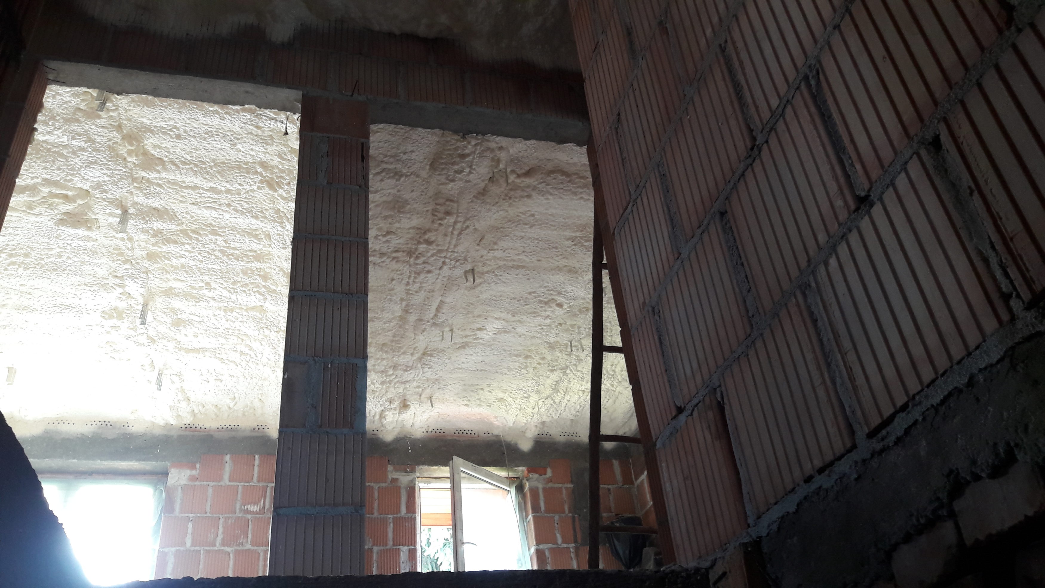 Właściciel domu wybrał docieplenie dachu jako barierę termiczną oraz wygłuszenie stropu. Zaaplikowano grubość 20 cm. Jak w poprzednich inwestycjach inwestor wybrał pianę PUR niepalną, samogasnącą – klasy E o przenikliwości cieplnej 0,034. Kierował się rozsądkiem z myślą o oszczędności na ogrzewaniu zimą a dobrą klimatyzacją latem.